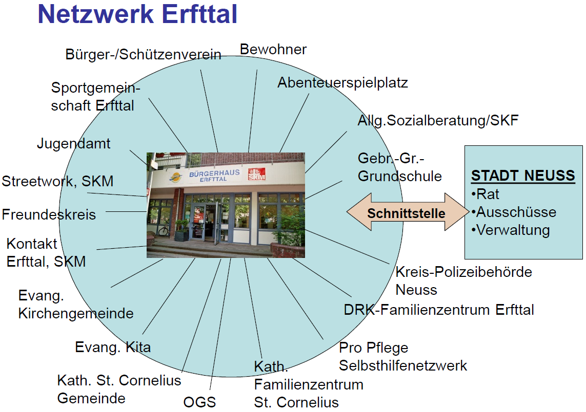 Anwohner des Stadtteils + Bürgerhaus Erfttal (SKM) + Bürger- u. Schützenverein Erfttal + DRK-Familienzentrum Erfttal + Ev. Kirchengemeinde Gnadental-Erfttal + Ev. Kindertagesstätte Bedburger Straße (DW Neuss-Süd) + Freundeskreis d. Dt. a. d. ehemaligen SU + Gebrüder-Grimm-Gemeinschaftsgrundschule + Jugendamt (Stadt Neuss) + Kath. Kirchengemeinde St. Cornelius + Kath. Familienzentrum St. Cornelius + Kids-Treff + Kontakt-Erfttal (SKM) + Kreis-Polizeibehörde Neuss + Pro Pflege-Selbsthilfenetzwerk + Schuldner- u. Insolvenzberatung (SKM) + Sozialberatung (SKF) + SG-Erfttal + Streetwork Erfttal (SKM) + Tagespflege (DW Neuss-Süd) + Türkisch-Islamischer-Kulturverein