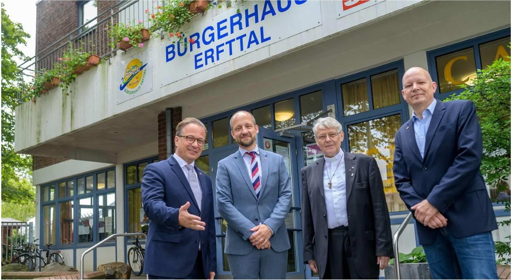 Bruder Gereon (3.v.l.), erster Sozialarbeiter in Erfttal, wurde von Reiner Breuer, Philip Benning und Paul Petersen als Ehrengast begrüßt. Foto: Georg Salzburg (salz)